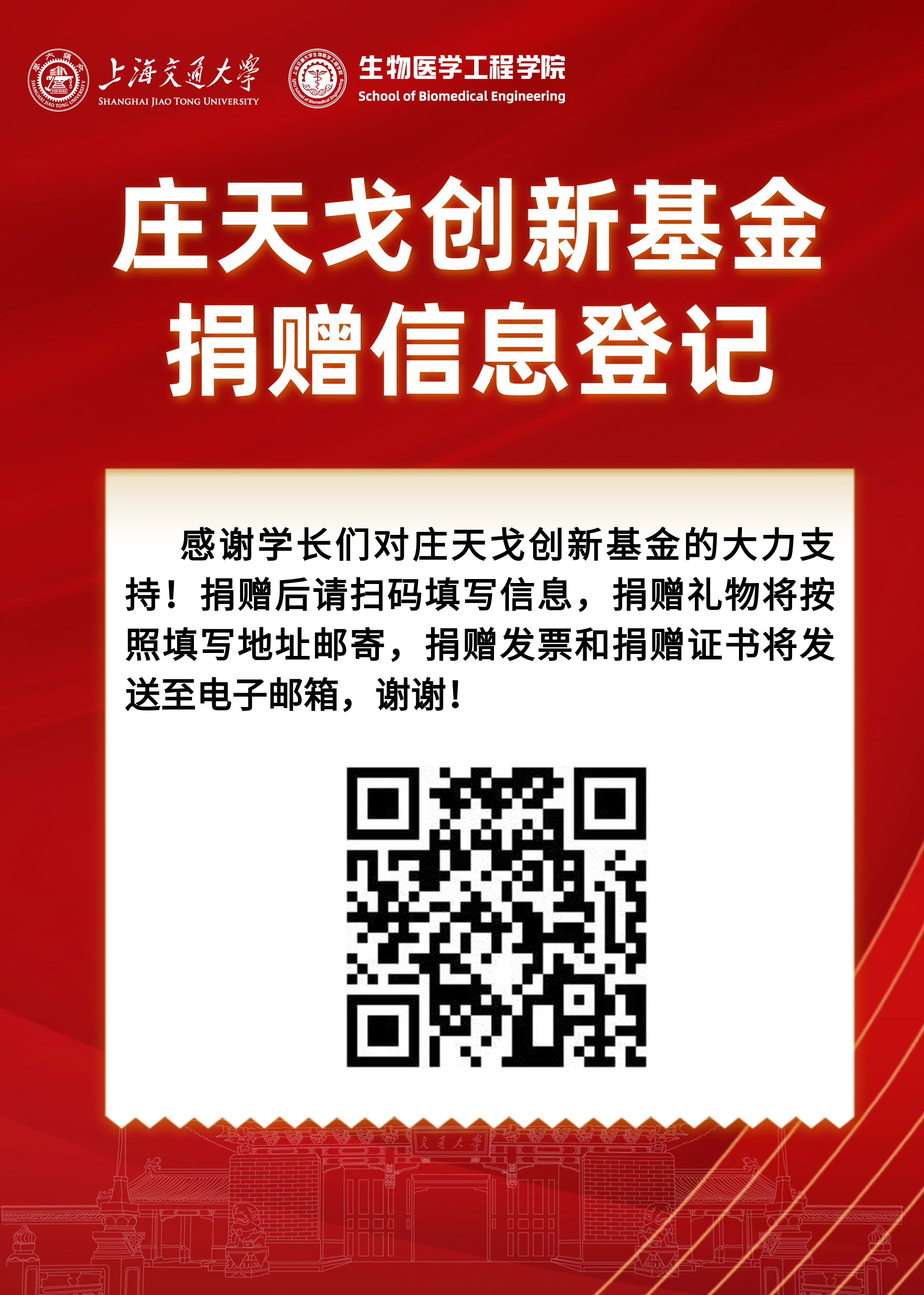 我们倡议建立“庄天戈创新基金”,以此鸣谢庄老师对生物医学工程学科建设、教书育人、科研创新的突出贡献,并为生物医学工程的创新打造一个支持的平台, 建立起校友与在读生的纽带。