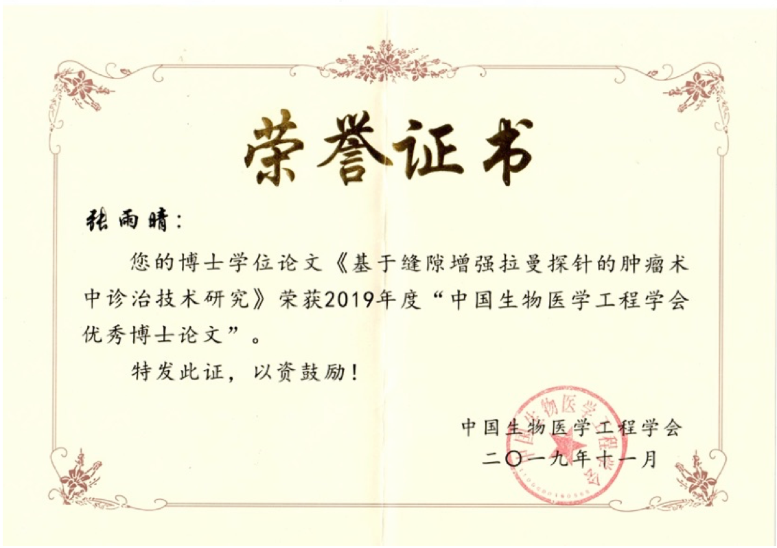 为加强高层次科技人才的培养,鼓励创新精神,提高博士教育及博士学位论文的质量,中国生物医学工程学会启动2019年度“中国生物医学工程学会优秀博士论文奖”,beat365官网2018届博士毕业生张雨晴(指导老师:叶坚)的博士毕业论文《基于缝隙增强拉曼探针的肿瘤术中诊治技术研究》在评选工作中脱颖而出,并于2019年11月14-16日在“2019中国生物医学工程学会大会暨创新医疗峰会”上进行了颁奖。
