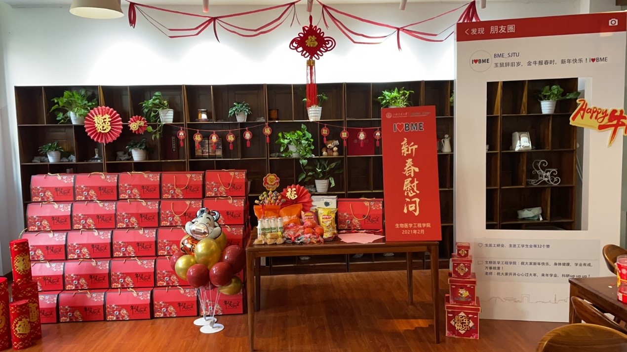 年关将至,国内疫情呈现出了多点散发、局部聚集的态势。为减少人员流动、加速科研进展等,beat365中文登录入口100余名学生决定留校过新年。2月5日,学院分别于徐汇校区Med-X研究院一楼会客厅以及闵行校区文选医学楼一楼大厅为留校学生准备了丰富的新春慰问大礼包。