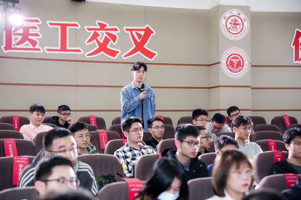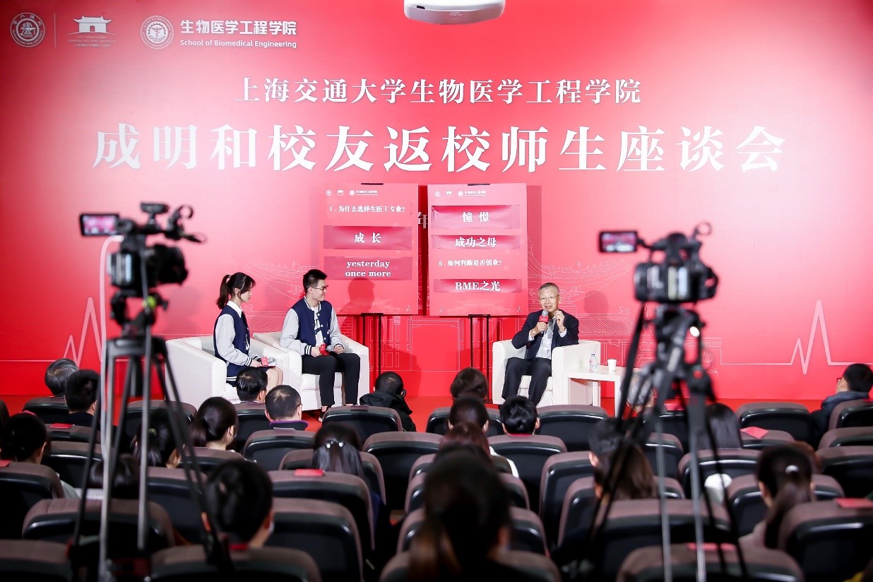 座谈会全程在热烈的气氛中进行,主持人在开场以互动的方式对成明和学长做了简要介绍。随后,成学长与大家分享了自己的成长经历,从交大的校园生活谈起,讲述了步入生医工行业之初的拼搏历程,同时也分享了创业与守业之路如何坚守初心和与时俱进。