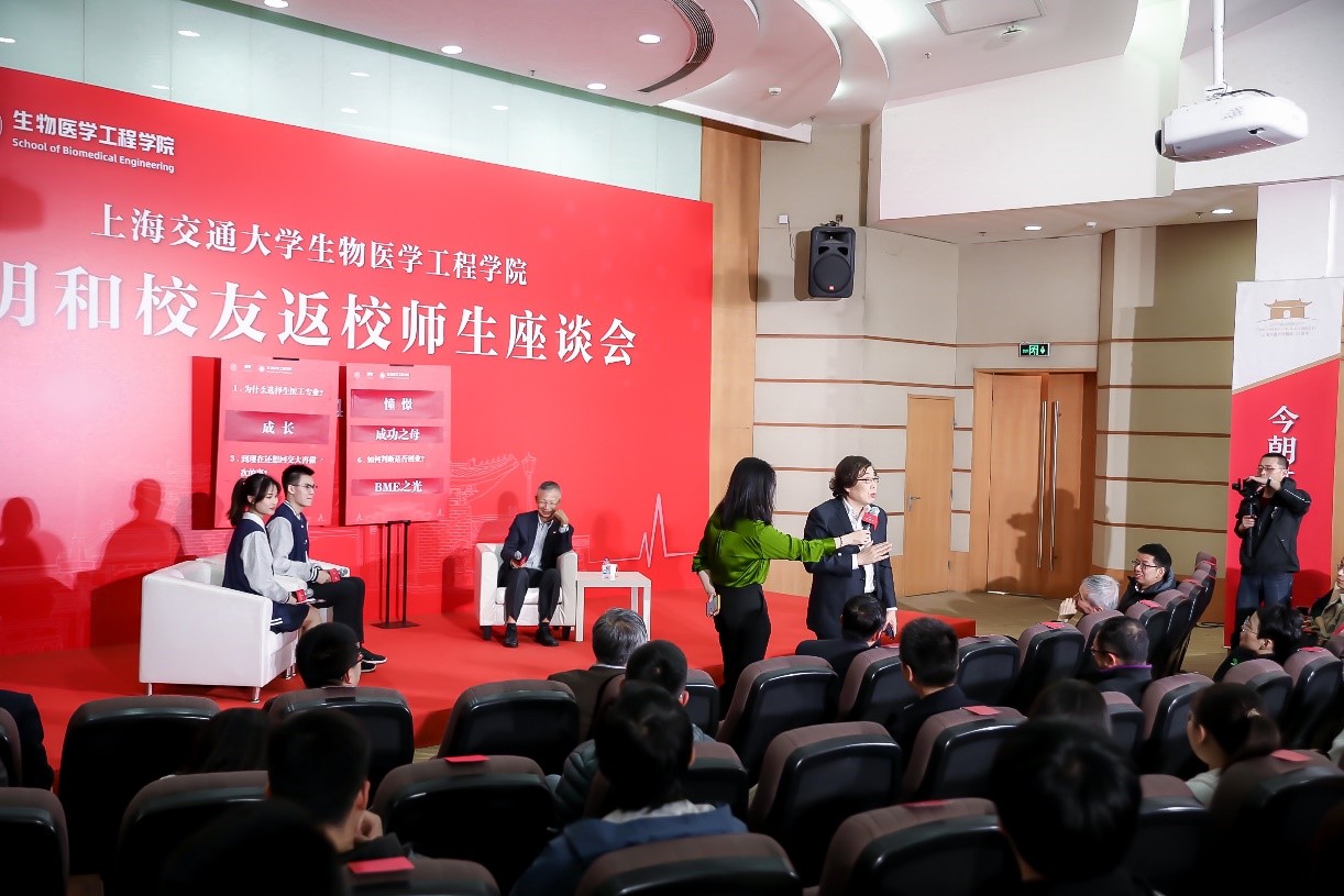 正是交大好风景,今朝共叙思源情。4月10日下午,beat365中文登录入口举办125周年校庆日学院特别活动——成明和校友返校师生座谈会,百余位师生、校友齐聚闵行校区文选医学大楼一楼报告厅,与学长面对面交流。生医工学院党委书记季波、常务副院长金学军、副院长孙建奇、党委副书记孟祥琦等学院领导现场参会。活动在线上进行同步直播,生医工学院2019级直博生刘睿豪、2019级硕士生唐婉芝担任主持。