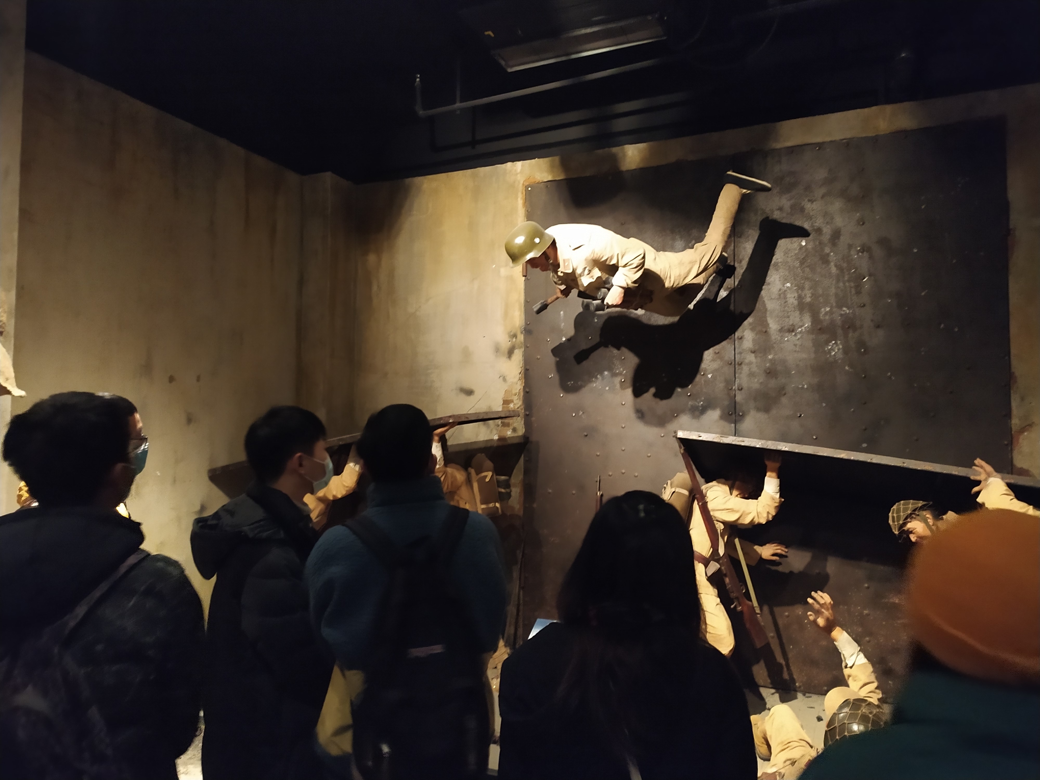 纪念馆内最令人震撼的一个场面还原是,当多次进攻失败的日军恼羞成怒,用坦克引导步兵对大门进行冲击时,年轻敢死队队员,在身上绑满了手榴弹,从楼上一跃而下,同10多名敌人同归于尽。电影《八佰》也对这一壮烈的场面进行了极大的描绘和还原,让我们感受到那场战斗的惨烈以及先辈们保家卫国、舍生取义的大无畏精神。