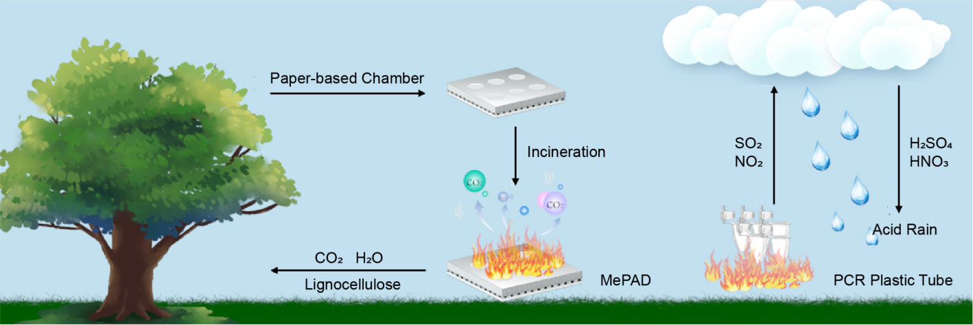 该作品面向当前社会海量的核酸检测规模需求以及医疗废弃物处理困难的社会痛点,研制出了一款纯纸基的环保型即时核酸检测装置,在保证检测准确率的同时,简化医废处理流程,极大减少碳排放和有毒废物产生。