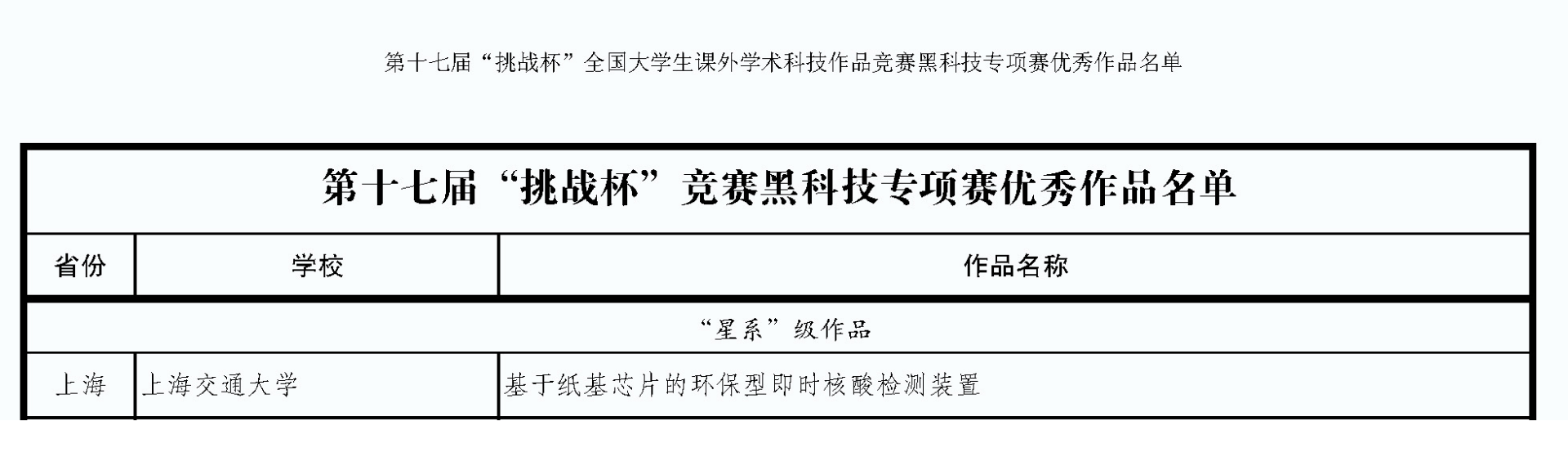 beat365官网大四学生张晓负责的《基于纸基芯片的环保型即时核酸检测装置》作品在第十七届“挑战杯”竞赛“黑科技”专项赛中评定为“星系”级作品,荣获此项专项赛的最高奖项。该项目指导老师为丁显廷教授,参与成员还有大四学生杨逸雯。