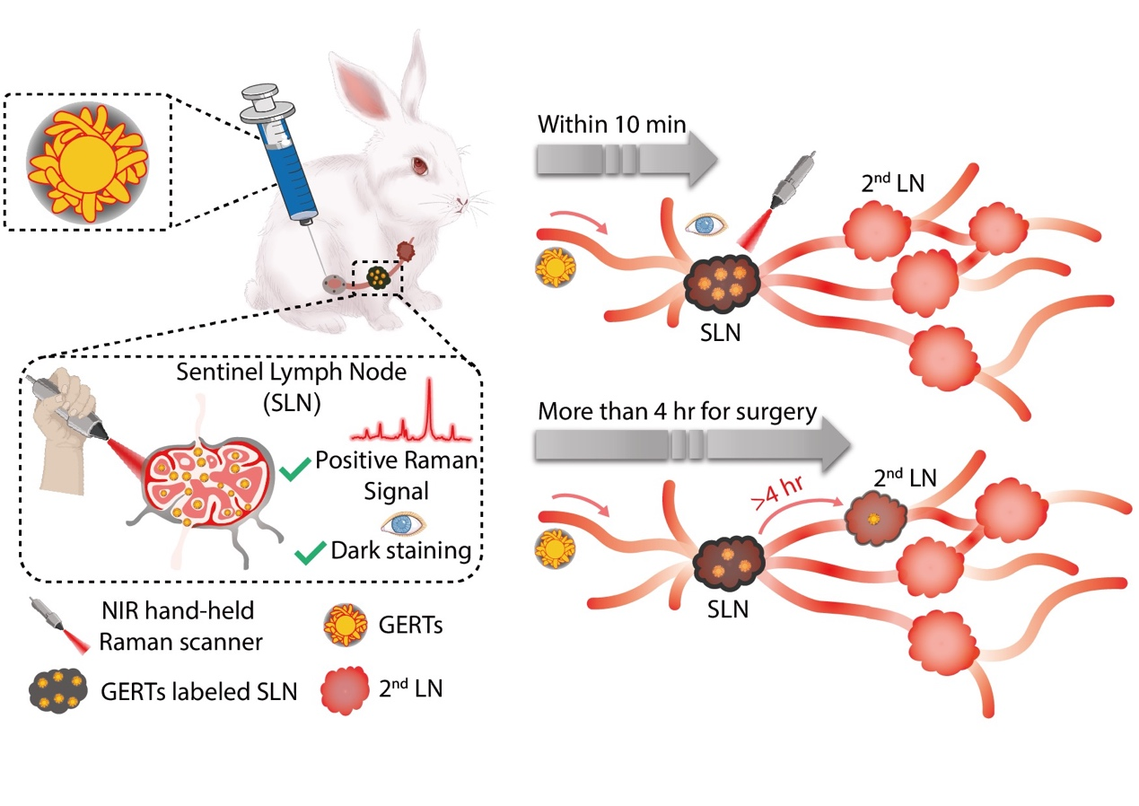 新技术的应用场景是将拉曼增强定位剂注射于实体肿瘤周围,定位剂经淋巴系统扩散到前哨淋巴结并停留,再使用便携式拉曼探测仪检测,以获取定位剂发出的独特的拉曼光谱信号,实现对前哨淋巴结的精确定位,这可以避免了不必要的大范围淋巴清扫,减少了淋巴水肿等诸多并发症。该技术基于拉曼信号可以进一步地为术者提供快速、准确、有效的前哨淋巴结肿瘤转移信息,有望代替术中冰冻病理检查的方法并指导后续手术方案,拓展前哨淋巴结成像及活检技术在临床中的应用。该项技术的相关成果入选了Journal of Materials Chemistry B 2020 Emerging Investigators, 并发表于Nature Communications、Advanced Science、Biomaterials等国际顶级期刊。