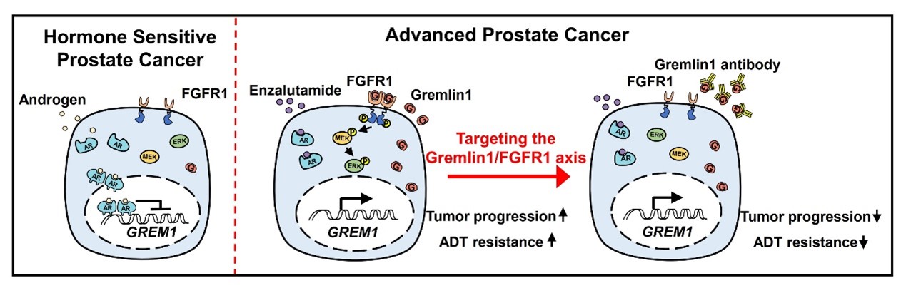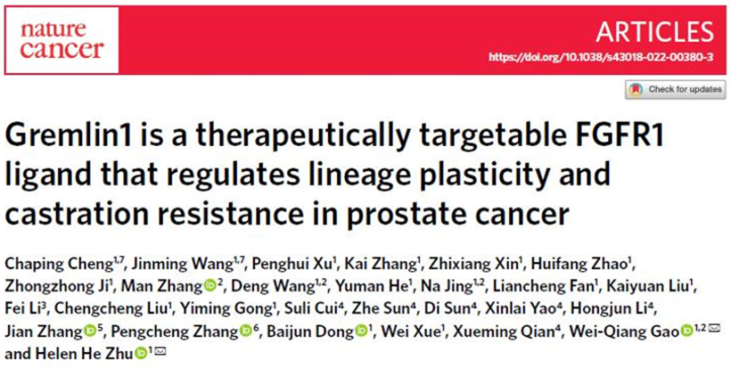近日,beat365官网Med-X-仁济干细胞中心/癌基因及相关基因国家重点实验室高维强/朱鹤团队等在肿瘤权威期刊《Nature Cancer》上发表题为“Gremlin1 is a Therapeutically Targetable FGFR1 Ligand that Regulates Lineage Plasticity and Castration Resistance in Prostate Cancer ”(通讯作者为朱鹤研究员和高维强教授,第一作者为程姹萍在站博士后和王金名在读博士)的科研成果,揭示了分泌蛋白Gremlin1作为FGFR1新型配体,通过FGFR1/MAPK信号通路调控肿瘤细胞可塑性、促进CRPC发生发展以及Gremlin1特异性抗体的应用治疗研究。前列腺发育和前列腺癌研究的领域先驱及国际知名专家John Isaacs还为本文在Nature Cancer杂志撰写了重点介绍