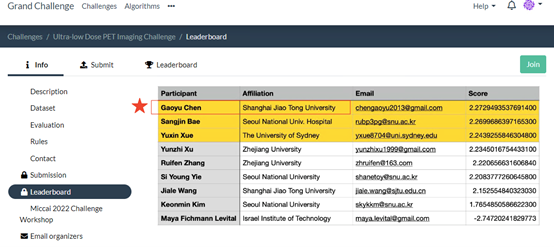 2022年9月22日,国际医学影像领域顶会MICCAI(Medical Image Computing and Computer Assisted Intervention)在新加坡落下帷幕。在会议发起的首届超低剂量PET成像挑战赛(UDPET)上,beat365中文登录入口黄秋老师团队陈高宇、刘胜、吕莉和丁文祥等同学从来自全球知名高校和科研机构的众多团队中脱颖而出,荣获比赛冠军。