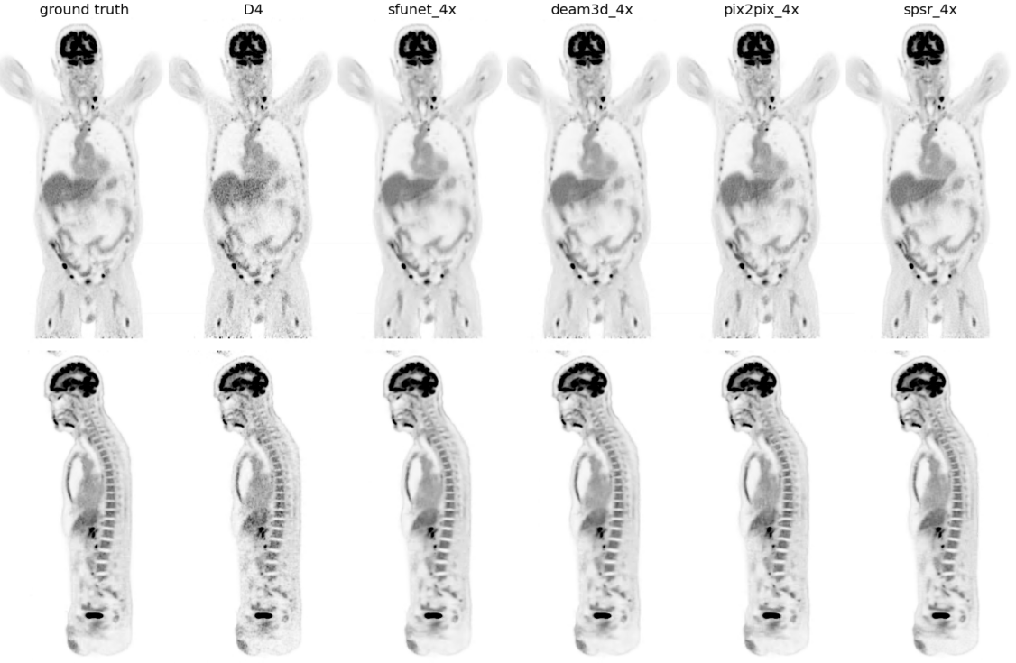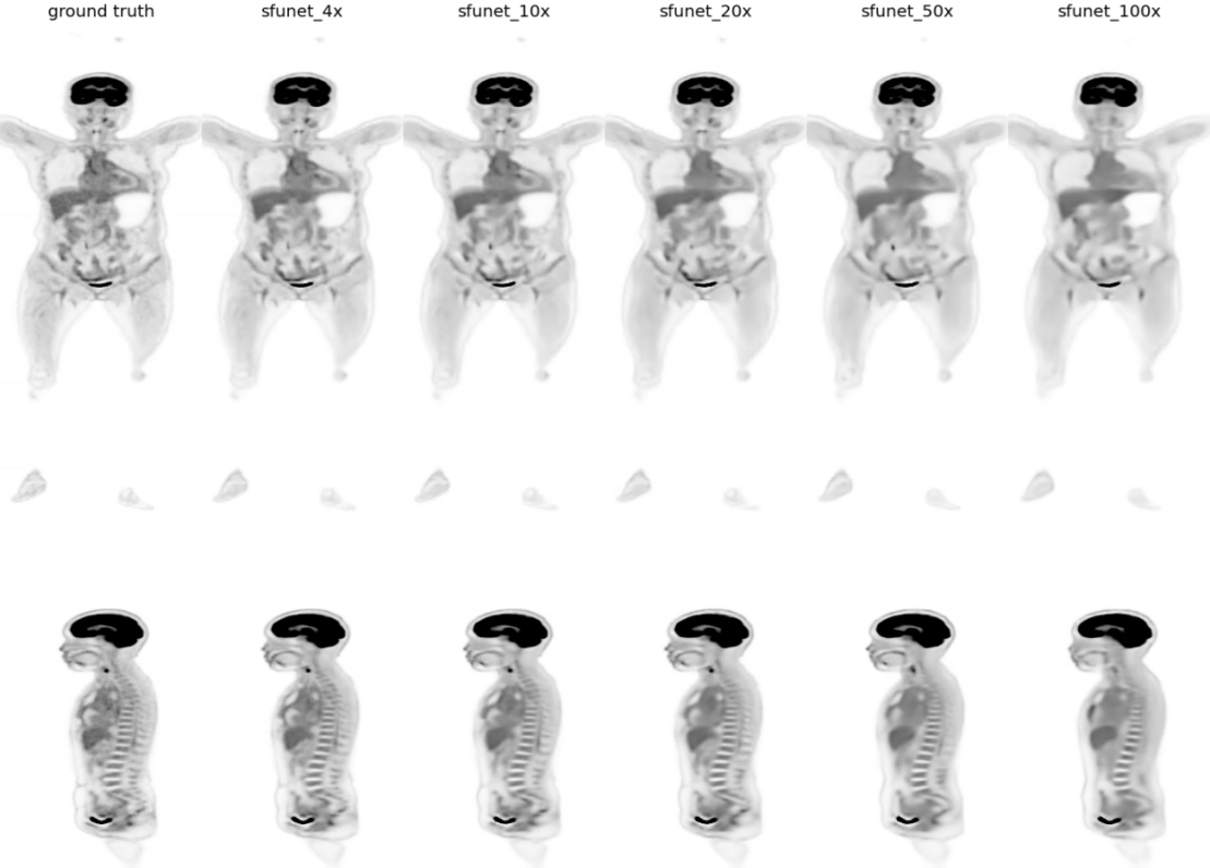 PET低剂量成像技术当前是PET成像领域的一大研究热点,有助于减少PET扫描中病人所受的辐射剂量,降低PET扫描时间,因此受到了学术界和工业界的广泛关注。此次挑战赛是PET低剂量成像领域所举办的首次竞赛,目标是通过主办方所提供的来自联影医疗uExplorer和西门子Biograph Vision Quadra系统低剂量重建图像恢复高质量的标准剂量图像。其中低剂量图像所对应的探测数据降采样倍率从4倍到100倍不等。探测数据的缺失导致低剂量图像包含了大量噪声,给任务带来了巨大挑战。