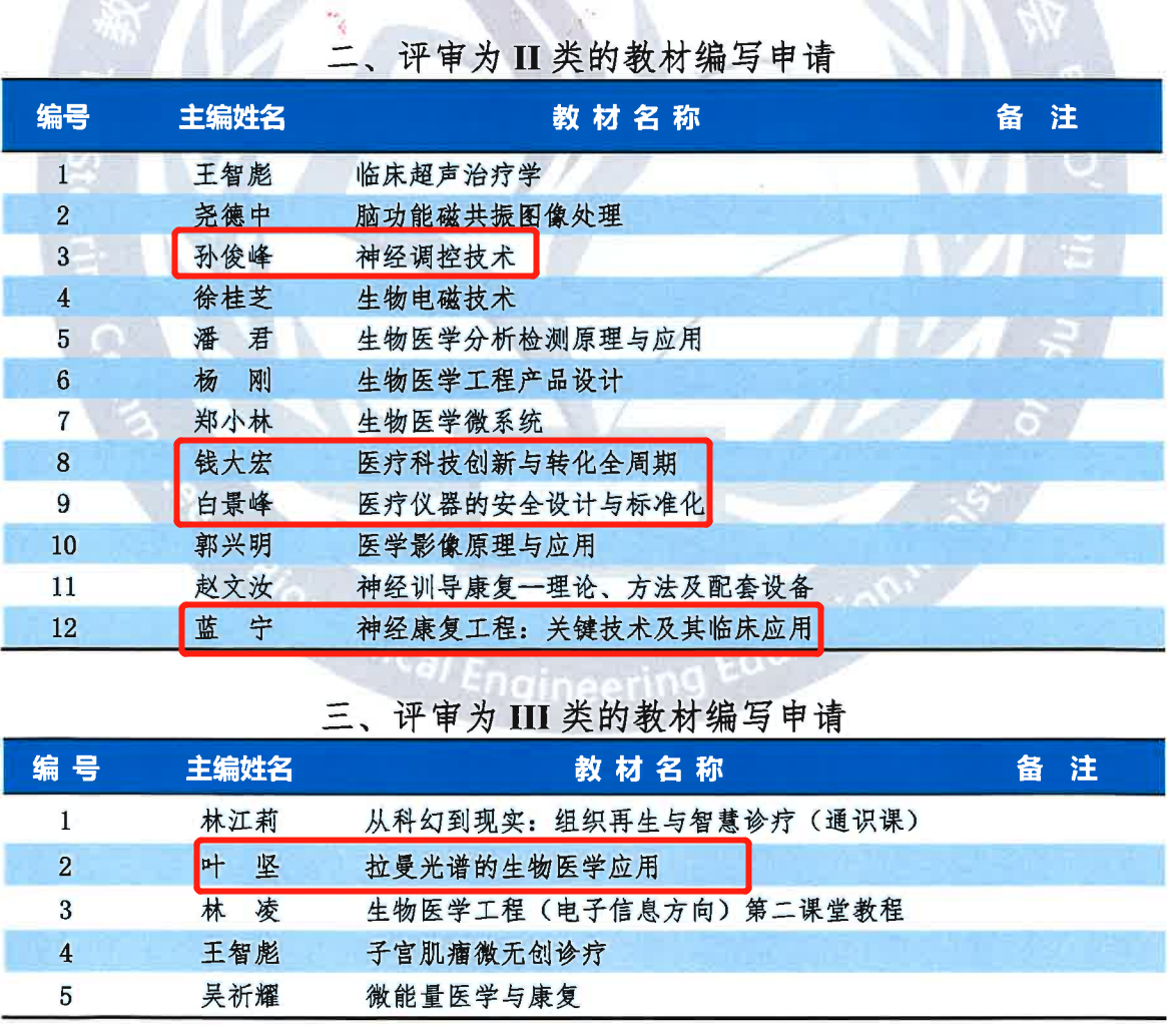 经评审,beat365中文登录入口4本教材立项列入教指委“十四五”规划教材,即孙俊峰教授担任主编的教材《神经调控技术》、钱大宏教授担任主编的教材《医疗科技创新与转化全周期》、白景峰教授担任主编的教材《医疗仪器的安全设计与标准化》、蓝宁教授担任主编的教材《神经康复工程:关键技术及其临床应用》。叶坚教授担任主编的教材《拉曼光谱的生物医学应用》被评审为Ⅲ类教材,向相关出版社推荐出版。