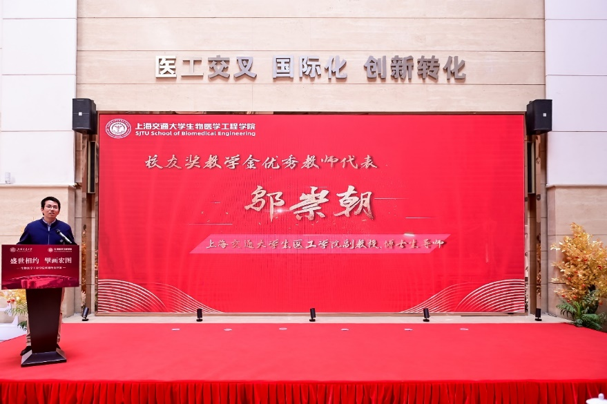 学院邬崇朝老师作为校友奖教学金优秀教师代表发言,他表示很荣幸获得校友奖教金,未来将在工作中不断积累育人经验,脚踏实地、辛勤耕耘、希望能通过自己真诚的付出满足新时代生医工学生的期待。