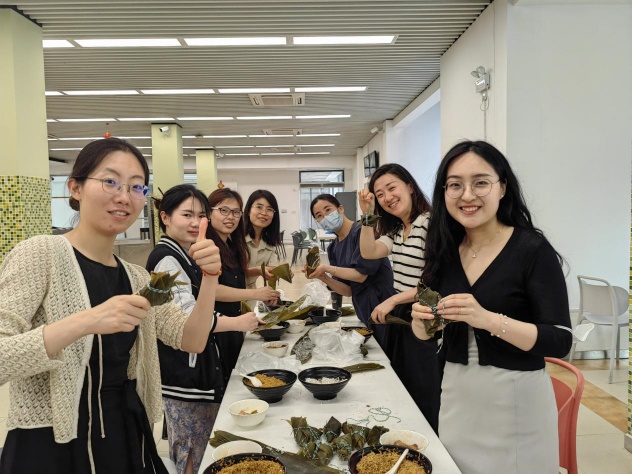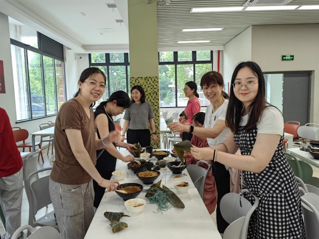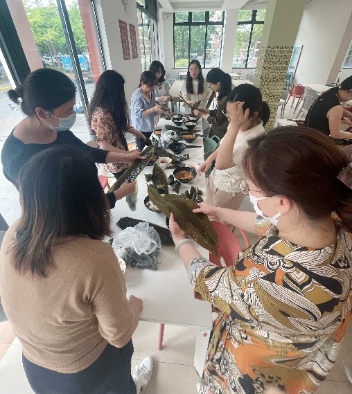 讲座后,大家一起来到第六餐饮大楼包粽子,活动现场准备了糯米、粽叶、蜜枣、鲜肉等材料,在师傅的指导下,无论是技术娴熟还是新手上路大家都积极热情,相互配合,折叶、填料、缠线,忙得不亦乐乎。在一片欢声笑语中,一个个形态各异的粽子相继诞生。