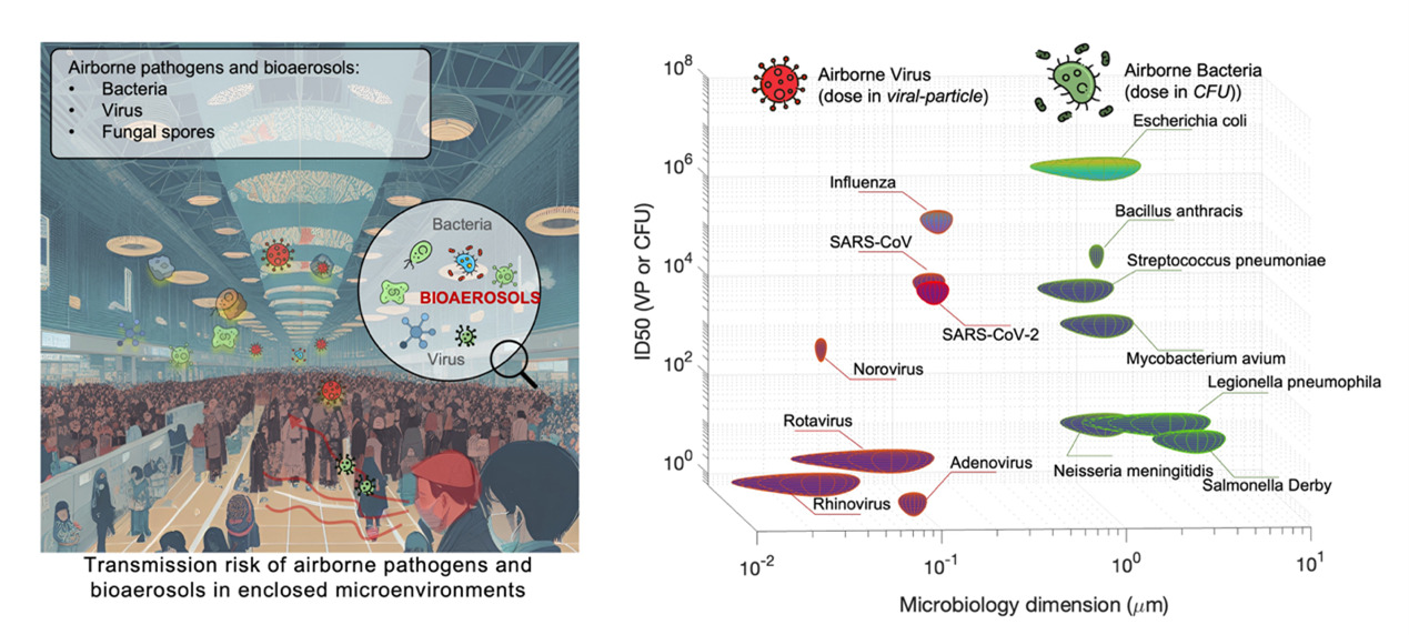 1. 本综述分析与整理了可在空气中传播的典型病原体(包括病毒、细菌和真菌),以及其主要生物学特征、感染剂量(ID50)和气溶胶传播特性(图1);