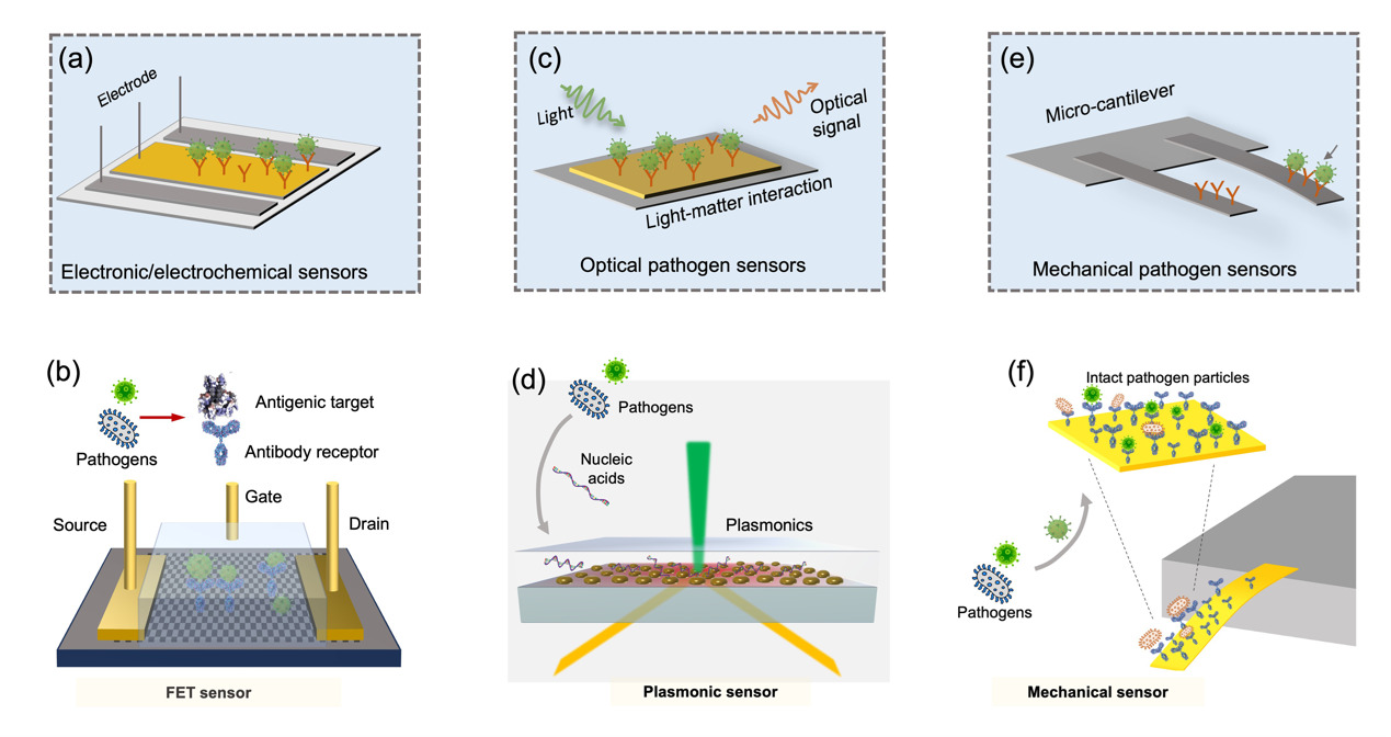图2:病原体生物气溶胶的电化学、光学等生物传感方法示意图