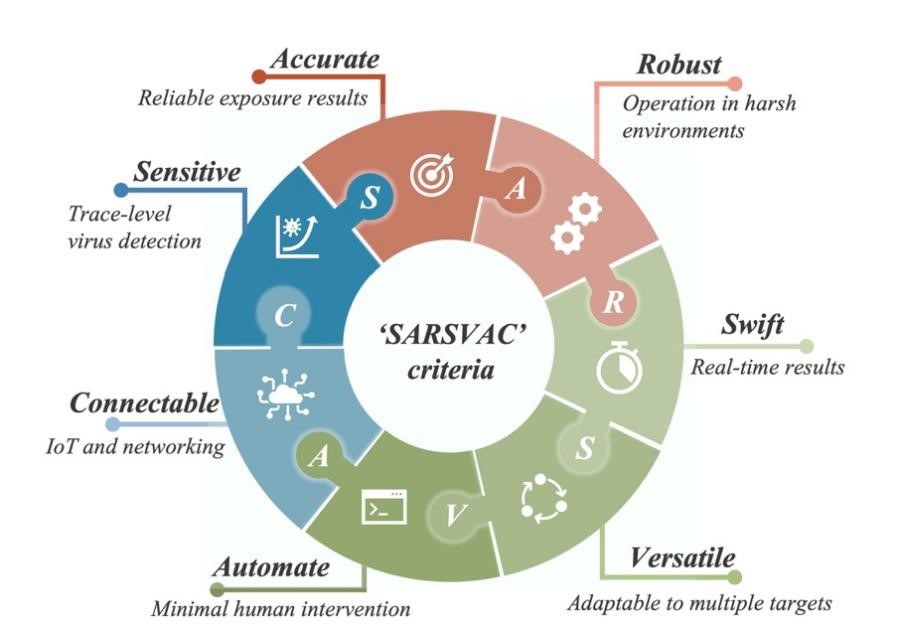 4. 分析总结了基于生物传感的病原体气溶胶检测方法(图2),并通过拟议"SARSVAC"标准,评估生物传感系统的检测灵敏度、准确型、时效性、功能性、自动化和物联网连接性等关键指标(图3),为实现有效的现场空气传播病原体检测和实时传播风险评估提供指导;