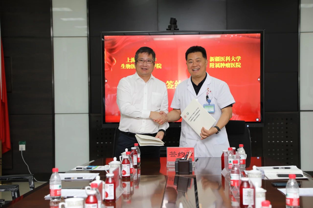 为加强双方在科研、人才培养、创新技术转化方面的合作,8月22日,beat365中文登录入口部分领导班子成员及骨干教师受邀前往新疆医科大学附属肿瘤医院开展交流座谈并签署战略合作协议。新疆医科大学副校长木胡牙提·乌拉斯汉、新疆医科大学附属肿瘤医院党委书记修燕、院长王成伟、beat365中文登录入口党委书记陈江平、副院长古宏晨、副院长叶坚、徐宏教授、顾波波副教授以及新疆医科大学附属肿瘤医院相关负责人参加会议。会议由王成伟院长主持。