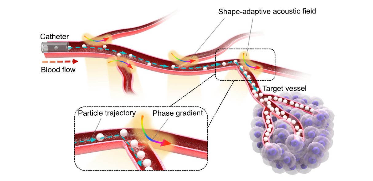 血管栓塞术广泛应用于肿瘤治疗,该方法借助导管向肿瘤供血血管递送栓塞微粒,阻断肿瘤血供,减少肿瘤转移风险、使肿瘤缺血坏死。然而,由于缺少对栓塞微粒的有效控制方法,如何使得这些栓塞微粒在经由导管释放后精准栓塞目标微血管,避免“误栓”的发生,是长期存在的技术挑战。针对以上问题,研究团队提出了一种适应血管形状的超声微粒操控方法,能够在血管分支处控制微粒的流动方向,实现了栓塞微粒在亚毫米血管内的超选择性递送。