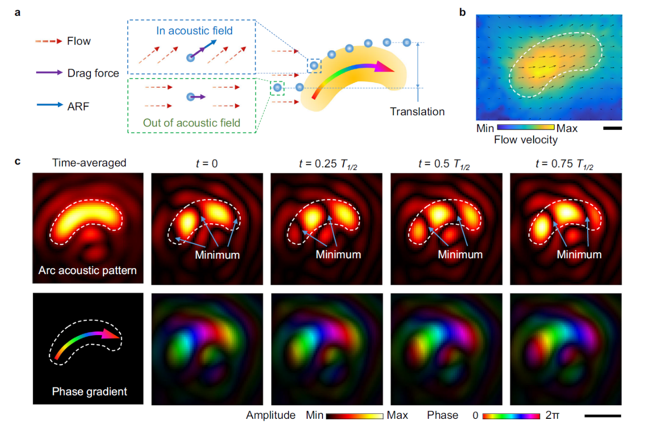 声场图案对微粒的控制机理主要从声辐射力和声流效应解释(图2)。随流体运动的微粒,遇到弧形的声场图案时,会受到相位梯度引起的声辐射力及声流效应,这些声场作用能够促使微粒的流向发生改变,从而起到控制微粒流向的效果。