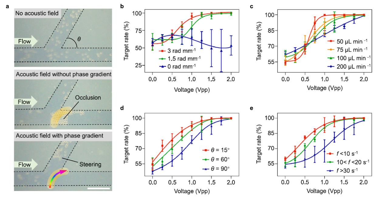 研究者首先在微流道分支中探讨了声场图案控制微粒流动方向的效果(图3)。当存在足够的声压幅值和相位梯度时,声场图案能在不同的流体速度、分支结构、粒子流量条件下,高效地控制微粒转向,接近100%的微粒能被递送到选定的分支。这表明声场操控能适用于多样的流体环境,且能够做到高通量的微粒定向递送。
