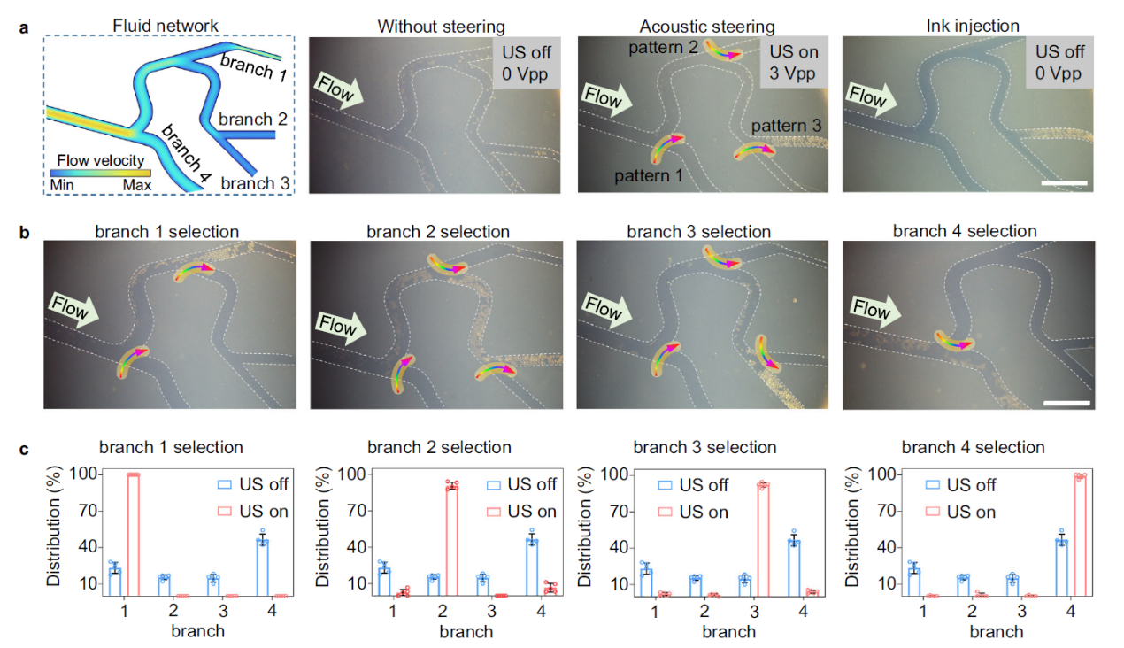 研究者进一步在多分支的流道中,探讨了声场实现超选择性栓塞的可行性(图4)。在类血管结构的多分支流体网络中,通过布置在流道分支图案化声场,微粒的流动方向被有效控制,并最终在选定的流道分支实现栓塞效果。通过改变声场图案在流道网络的位置,微粒运动到各自对应的目标流道,证实了声场在超选择性微粒递送与栓塞的潜能。