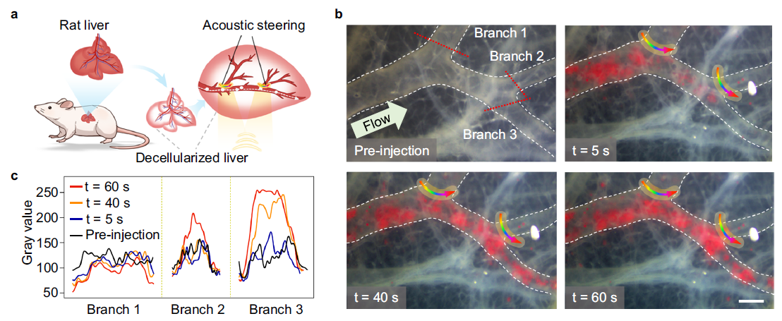 声场控制微粒选择性的栓塞效果在离体的大鼠肝脏血管内进一步验证(图5)。研究者采用脱细胞技术制备了大鼠肝脏的透明化血管模型,并构建了适应血管分支的声场图案。注入血管内的栓塞微粒会在声场作用下,选择性地到达并栓塞特定的血管分支,表明声场具备在血管网络中控制微粒流动方向的能力。