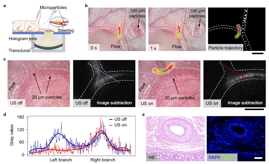 最后,研究者在活体的兔耳动脉中,验证了声场选择性导向微粒的可行性(图6)。声场被投射在兔耳动脉的分支处,控制微粒的转向。微粒流动轨迹证明了声场能操控单个或高通量的微粒在活体血管中的选择性递送。此外,组织学切片显示,受到超声作用的血管保持完整结构且没有凋亡信号,证实本方法优良的生物相容性。