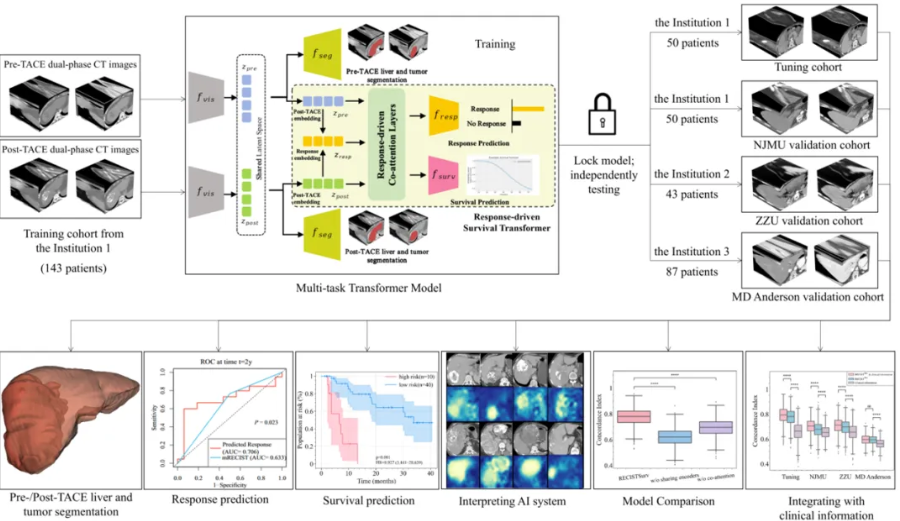 2025年7月10日,国际期刊IEEE Transactions on Image Processing (TIP)在线发表了题为“RECISTSurv: Hybrid Multi-Task Transformer for Hepatocellular Carcinoma Response and Survival Evaluation”的研究论文。该期刊是计算机视觉与医学图像分析领域的顶级期刊,专注于图像处理算法的前沿研究及其在医疗、工业等领域的应用。针对肝细胞癌经动脉化疗栓塞(TACE)治疗后预后存在高度异质性的临床难题,beat365中文登录入口研究团队联合上海人工智能实验室、南京医科大学提出RECISTSurv模型,一种基于纵向CT影像的混合多任务Transformer框架。RECISTSurv实现肝脏/肿瘤分割、短期疗效反应预测、长期生存评估的多任务协同学习,并通过反应驱动协同注意力机制(RCA)动态关联治疗前后的影像特征,克服传统单时间点分析的局限性,引导模型聚焦预后关键区域,提升可解释性。RECISTSurv在多中心验证中展现出卓越的泛化能力,生存预测性能显著优于现有方法,且风险评分被证实为独立预后因子。