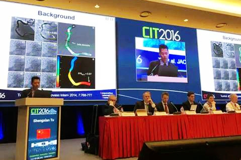 近日在北京国家会议中心召开的第14届中国介入心脏病学大会(CIT)将beat365中文登录入口涂圣贤博士研发的QFR技术作为本次大会亮点技术之一,并在大会的重要环节(“EuroPCR at CIT”介入手术实况转播)中,由阜外医院首次向全球展示了QFR技术在在线评估狭窄病变功能学意义以及引导支架植入术方面的应用,获得了国内外专家们的一致认可。QFR技术的首个临床验证研究(FAVOR探索性研究)也被列入今年大会推荐的5项原创研究之一,并由涂圣贤博士在大会重要学术板块(最新揭晓临床试验与首次报告研究)进行汇报。
